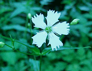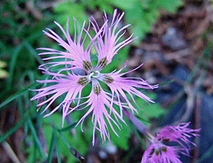 タカネナデシコ よく似たカワラナデシコは 花びらの切れ込みが浅い とか タカネナデシコは、3分の2くらいまで 切れ込んでいるとか |
