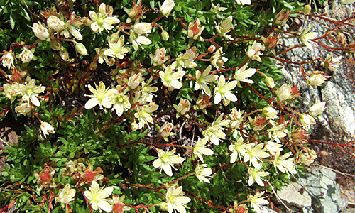 イワベンケイ これは雄花 雌花は小さく子房のほうが目立つ 受精すると子房が赤くなるので 赤いイワベンケイと、黄緑色の イワベンケイがあるように見える |