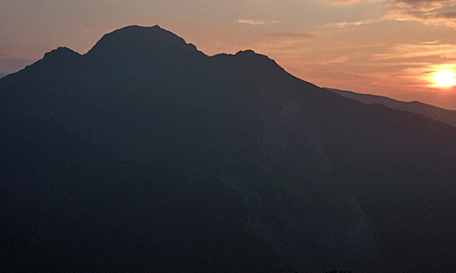 | 三伏峠小屋を なんとか足元が見える4:30を待って出発 尾根沿いの道は廃道 いったん沢道の途中まで下ってから 元の道に合流 大きな崩れ跡! 約40分で烏帽子岳 丁度朝日が昇り始めた ↓ |