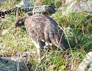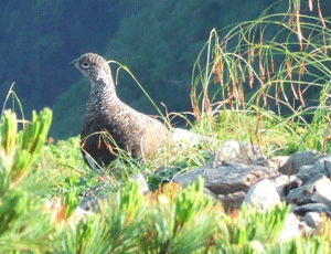 | ライチョウの親子 小河内岳直下で登山道を歩いていた すぐ近くまで近寄ってくるので 脅かさないようシャッターを切る 鳥も登山道の方が歩きやすいようだ 右 ライチョウの子ども |