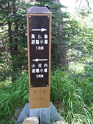 | もうすぐ高山裏避難小屋 高山裏避難小屋まで1km 三伏峠からは7km地点 |