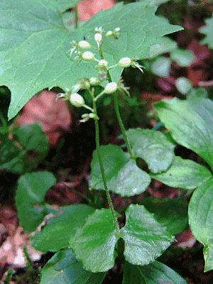 コフタバラン 2枚の葉が対生しているので『フタバ』 高山裏避難小屋から荒川岳に向かう 薄暗い樹林の中に咲いていた |
