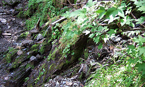 | 水場 登山道脇に水場があった ここで頭から水を被った じんじんと痛くなるような冷たさ 流れ出る水の傍にクロクモソウ このあとも、樹林の中をほぼ水平に歩く |