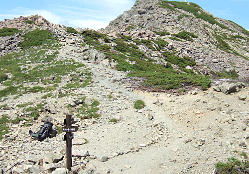 | 分岐の標識と中岳 中岳も遠く感じたが 分岐にザックを置いて登ってみたら わずか10分 なんと背中の軽いこと! |