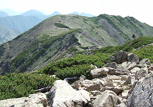 | やっと稜線に出た!! はるか向こうに荒川中岳が見える 先行者の姿も、団体の姿も 小さく見える 三伏峠小屋から、 同じ荒川小屋を目指すはわずか4〜5人 皆、単独の登山者だった |