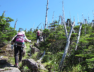 | すぐ急登が始まる たらたらの木道歩きの後 いきなりの急登が約15分 周りは枯れた針葉樹と若木 その後はしばらく緩い樹林歩き |