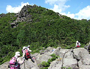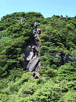 観光地の坪庭に近いが ロープウエー駅から近いのに この岩ごろごろの三ツ岳は 足元がしっかりしていないと歩けない そのおかげで喧騒から無縁の 静かな山になっている |