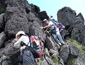 三ツ岳頂上 岩を乗り越え、鎖を伝い 岩の頭をひょいと飛び越え、 岩のへりをたどって 登りついた所が三ツ岳の頂上 休憩できる所は狭い岩の上だけ 岩と岩の隙間は深い穴 少し下った平らなところで休憩とする |