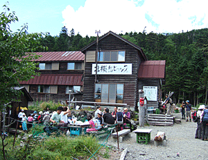 | 北横岳ヒュッテ 分岐からすぐ北横岳ヒュッテに着 大勢の人で賑わっている 冬ここで泊まったことがあるが こんな賑わいは、はじめて |