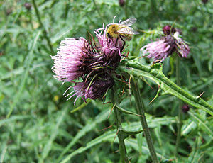 | アザミの仲間 痛そうなとげを持った葉っぱ 花はうつむいて咲いている |