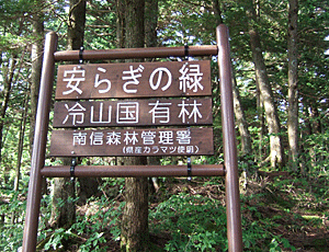 | 「安らぎの緑」 針葉樹と苔に囲まれた登山道を歩いて ふと林道に出た その林道を下らず 左の細い道に入ってしばらく歩くと 車道が見下ろせた そこが竜源橋 竜源橋のすぐ上に立っていた看板には 「安らぎの緑」とあった 本当に、苔と草原の緑に 安らぎを感じさせられたコースだった |