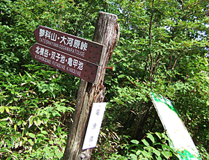 蓼科山への分岐 小さな沢が登山道となっているが ほとんど水はなし 途中大きな涸沢を2本渡ったが 出水することもあるとか 途中、沢の水は滝の湯川となり 左側を流れていたが ふと気がつくと沢音がしない 伏流水になったらしい |