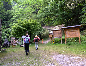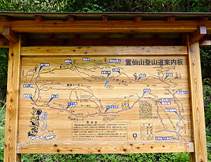 登山口に到着 駐車場に建っていた案内図 手彫りで、着色がしてある立派な物 |