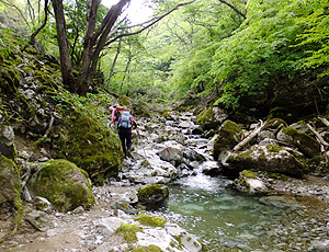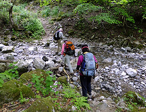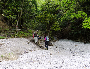 | 何度も沢を渡る 最近雨が降っていないので水量は少ない |