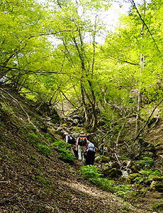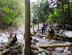 | 昨年も来ているが、ルートが変わっていた また大雨が降ったのだろうか・・・ 横倒しになった木を乗り越して進む もうすぐ「一の谷」 土石流の痕は、ここが一番ひどい |