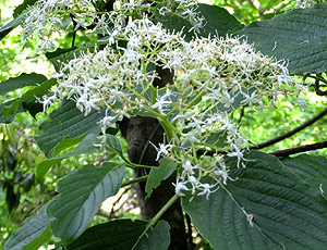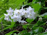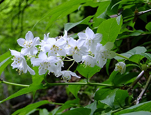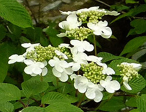| ヤブデマリ:スイカズラ科 登山口(P)に咲いていた 『時折水の流れるような谷から斜面下部などに多い』 ・・・そうだが、まさにぴったりの地に生育していた |