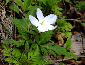 | ニリンソウ:キンポウゲ科 霊仙山の山頂、石灰岩の間でも咲いていた 背丈2〜3cm 以前の谷山谷は、 ニリンソウのカーペットを敷いたような光景だったのだが・・・ |