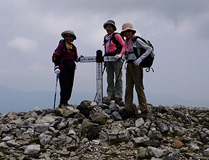 急な登りのあとに着いたのが「北霊仙山」 伊吹山はボンヤリとかすんでいた |