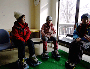 | 多治見から高速を使って約3時間半で 乗鞍観光センターに到着 輪かんは持ってきたが、 全員スノーシューを借りることにした (ODSSで借りた) 係の人から親切に付け方・歩き方を教えてもらった |