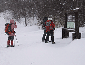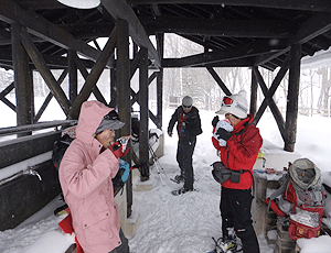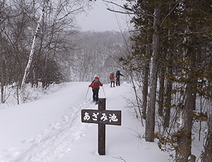 すでに11時を過ぎている スノーシューは、12時まで(ぎりぎり13時まで)に 返すことになっている スキー組との待ち合わせ時刻は14時 これから牛留池〜善五郎滝へ行く ぐるりコースは無理と判断して 引き返すことになった |