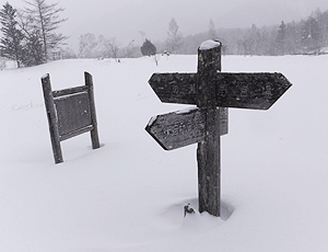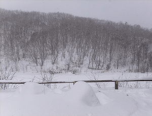 | 観光センターの矢印に従って車道を歩く | あれ?ここから善五郎滝へ行けたんだ・・・ う〜ん、トレースが無いと行けただろうか・・・ 「湯けむり館」で入浴後帰宅 雪の降る中の露天風呂も、 顔だけ出していればぽかぽかで乙なものだった |