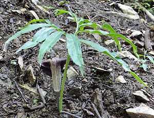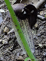 ウラシマソウ:サトイモ科 後姿や横顔だけでは「釣り糸」が見えないが 葉の下に咲くこと、葉の形、黒っぽい花色から ウラシマソウと思われる 斜面に咲いていたので、正面からは撮れなかった |