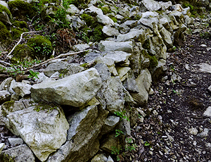 | 西出商店のおじさんは 落石でこんな石垣を作っている 帰りにひょっこり出会ったが 廃パイプで休憩用の椅子を作っていると 麓から山頂までがおじさんの守備範囲 本当に頭が下がる |