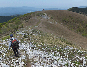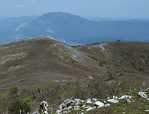 霊仙山最高点の手前から 遠くに伊吹山 手前は、左に北霊仙山と右に避難小屋 |