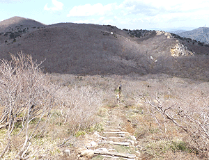 ここから風に吹かれまくっての稜線歩き 左手に日本海もぼんやり見えたが、 寒くてゆっくりできず、つい早足になってしまう |