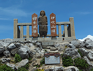 | 伊吹登山口バス停上にある神社(=登山口) 入山料1人300円を徴収するテントと 蛍光色のベストを着た数名の関係者がいた |