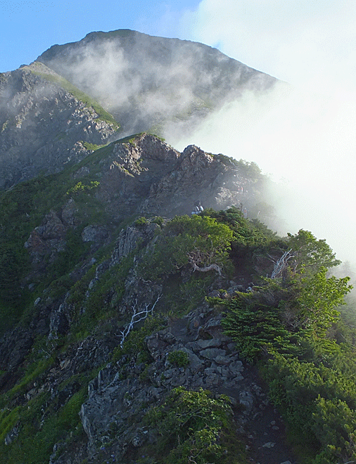 | ガスの動きが早い 目まぐるしく動くなか、聖岳を目指す いったん下って、眼前の岩峰を登る |