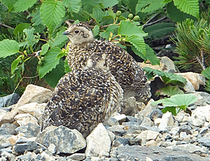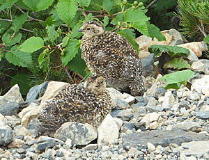 | グッグッ・・・と妙な音? ライチョウの親子だった ほんの2〜3m先、私が行こうとする方にいた しばらくじっと動かずに、カメラを操作していたが(こういう時のために無音にセットしてある) いつまでも歩かないわけにはいかない 「ごめんよ〜 そっちへ行きたいんだけど〜」 と声をかけながら歩きだすと 親も私の進行方向へ歩いていく 困るなあ・・・ その間に子供たちは、親と反対方向へ素早く移動した 十分人間を引きつけてから、親は登山道の外へ行ってしまった これでやっと落ち着いて歩き出せる |