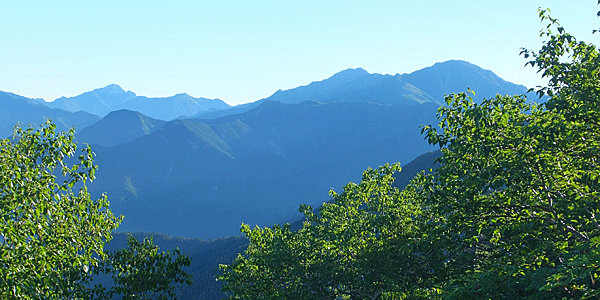 | ぱあ〜っと、視界が開けた 8:00 奥の山、左から、仙丈・甲斐駒・間ノ岳・農鳥岳らしい |