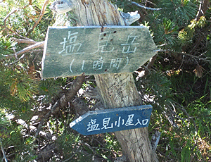 | 塩見小屋の案内 8:10 工事中で狭いので、休憩だけなら使わないように・・・の注意書きがあったので、通過して すぐ上の小広場で休憩 |