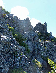 | 塩見岳手前の「天狗岩」という岩山を過ぎると、いよいよ岩が見えてきた 本格的な岩ばかりなら、ストックを片付けるが、「岩、時々たらたら」・・・のようなので、短くして持つことにした |