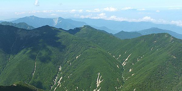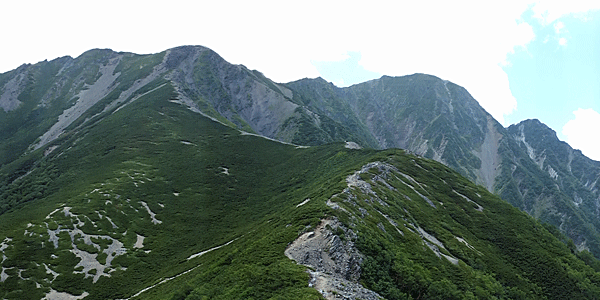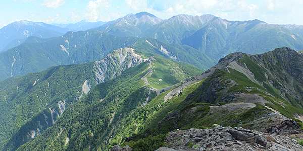 | 展望の良い尾根歩き まだ岩場は出てこない 塩見岳に登ったたあと、熊ノ平小屋までの尾根らしい 奥は、左に間ノ岳、右に農鳥岳 |