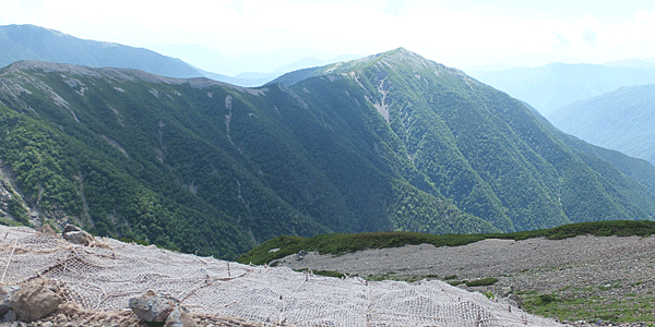 | 土にネットがかぶせてある 土砂流出防止だろうか・・・? 目の前の尾根は・・・蝙蝠岳方面かな? |