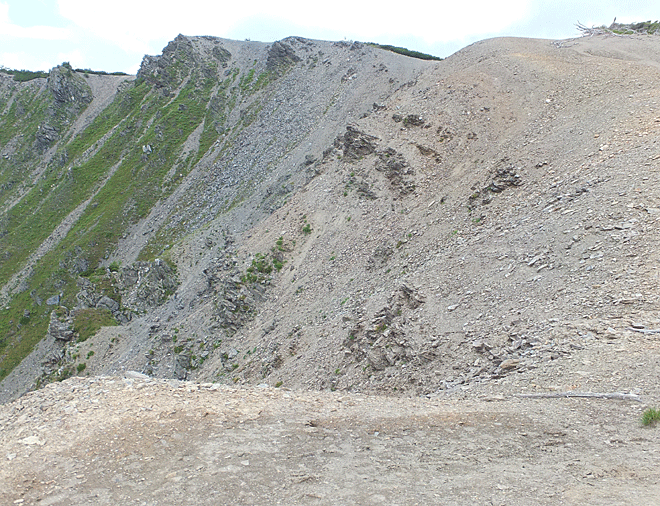 | 塩見岳・北俣岳分岐を振り返る 写真では大したことがないように見えるが、 実際は、急・ガレ・足を取られる・へっぴり腰で、ダブルストックを握りしめ、 ブレーキをかけながら必死で下ってきた・・・ 登るのも大変・下るのも大変・・・ |