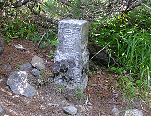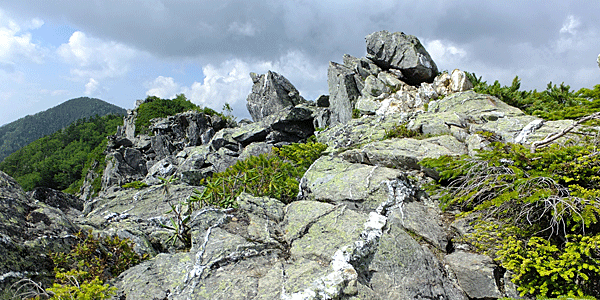 | 2時間ほども樹林の中を歩くといいかげん嫌になってくる 遠くで雷の音が聞こえてきた 樹林の中ならいいか・・・と思っていたら、突然稜線に出た 15:05 わっ、ここで雷が近づいてきたらどうしよう〜…と思ったら、またまた樹林の中に入っていった 地図を見ると、「竜尾見晴」とあって、「展望良好」とある なんの標識もなかったが、とがった岩の角を竜のしっぽに見立てたのかも・・・ |