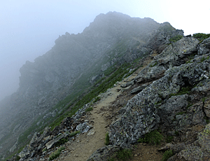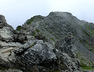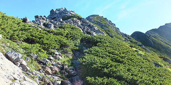 | まず目指すは三峰(みぶ)岳 岩ゴツゴツが見える |