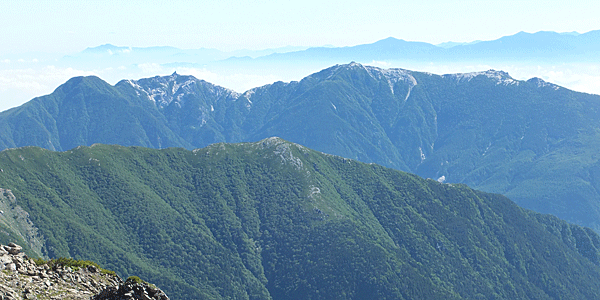 | やっと北岳が見えてきた(右) 左から、仙丈・・鋸岳・甲斐駒・北岳 |