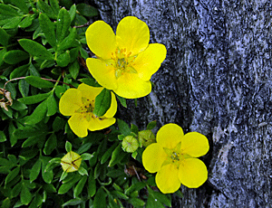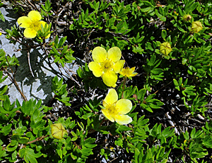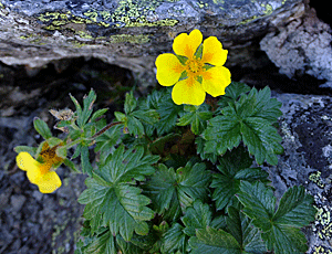 | ウラジロキンバイ:バラ科 『ミヤマキンバイに似ているが、 茎や葉の裏に綿毛が生えていることが名前の由来 北海道の礼文島や夕張岳、中部地方の白馬岳、八ヶ岳、 北岳、荒川岳などに生育する』・・・だって |