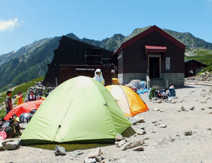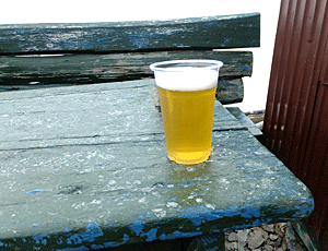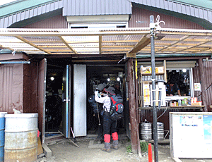肩ノ小屋に到着 14:25 宿泊の手続きのついでに、ビールを頼む ここには何と!生ビールがある 900円也 (玄関右側が生ビール販売所) 缶ビールに比べると、味が「なるい」=柔らかい 喉にキューッと来ない |