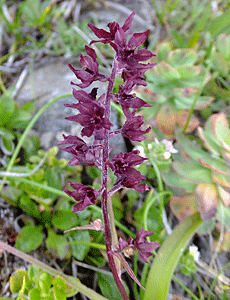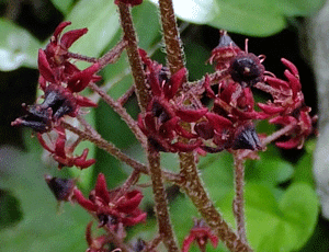 | クロクモソウ:ユキノシタ科 漢字名は「黒雲草」 これは、「黒」というより、「赤みの強い紫色」 左 全体の様子 右 黒っぽいものは、実 |