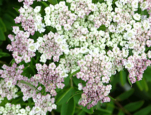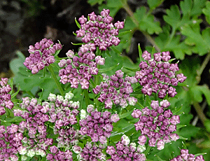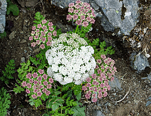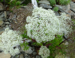 | イブキボウフウかな?セリ科 セリ科の花は判定が難しい もこもこした塊に、白っぽい部分と赤っぽい部分があるのに、目を惹かれた よ〜く見ると、ツボミのうちは赤紫色で、花が開いてくると白くなるようである そして、種になると黒っぽくなるのかな?(下段) |