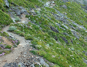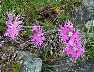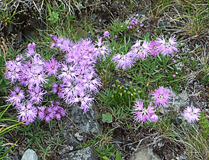 | タカネナデシコ:ナデシコ科 このトラバース道、この花がとても多い 濃い色・薄い色・白っぽい色など、色とりどり |