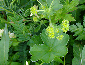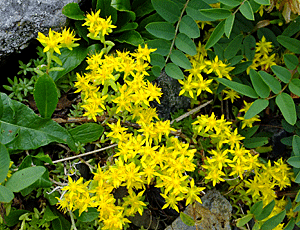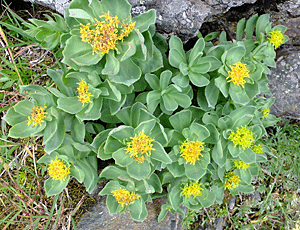 | ハゴロモグサ:バラ科 薄黄色の小さな花がかたまっている 『日本固有種。 北海道の夕張岳と北アルプスの白馬岳、南アルプスの北岳などに分布』だそうだが スペインで、そっくりさんを見たことがある |