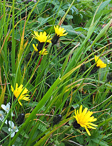 | カンチコウゾリナ(別名タカネコウゾリナ)かな? :キク科 よく似た花に、「ミヤマコウゾリナ」があり、 両者とも『全体に剛毛が生え、総苞が黒いという共通点』がある 区別は、 『カンチコウゾリナは葉先が尖り鋸歯が鋭いのに対し、 ミヤマコウゾリナは葉先が丸く、下部に大きな葉が付く』だって さて、これはどうだろう?? 花ばかりに注目して、葉に目がいっていない・・・ |