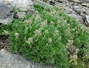 | ハハコヨモギ:キク科 『茎の頂に薄黄色の小さな花がこんもりと上向きに固まって咲く 頭花は十個以上付き、葉も茎も灰白色の毛が密生して、手のひら状の葉は細かく切れ込む 中央アルプスのほか南ア北岳周辺だけに成育している』・・・だって |