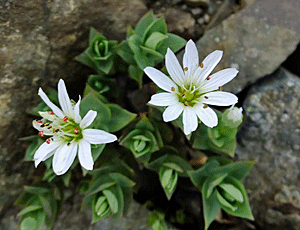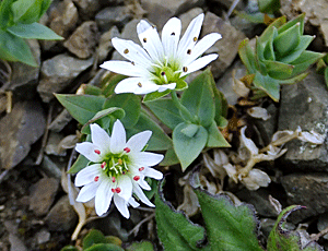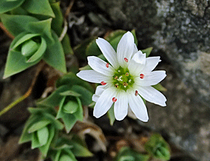 | シコタンハコベ:ナデシコ科 『花びらが5枚の白い花をつける 花びらは深く2つに裂けているので10枚のように見える』 咲いたばかりの花は、「葯」が赤色! |